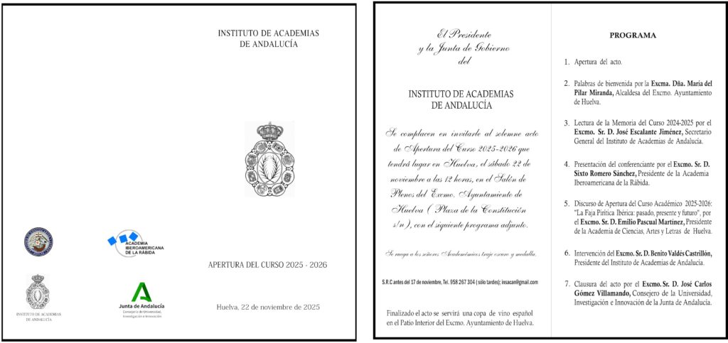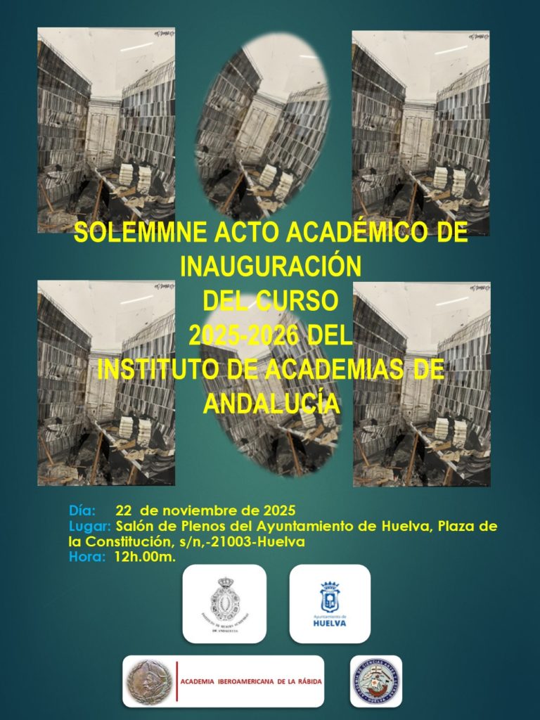 El acto de apertura del curso 2025-2026 se inicia en el Salón de Plenos del Excmo. Ayuntamiento de Huelva, Plaza de la Constitución, s/n-21003 (Huelva), a las 12h.00m. organizado por la Academia Iberoamericana de la Rábida y la Academia de Artes, Ciencias y Letras de Huelva, contando con la valiosa colaboración del Excmo. Ayuntamiento de Huelva.
