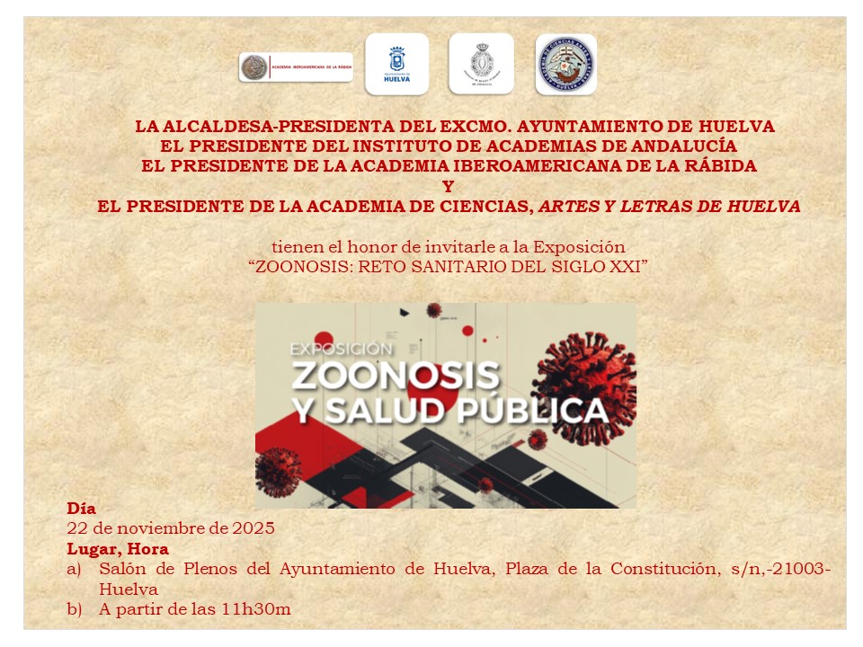 A partir de las 11h30m se podrá visitar en el Patio del Ayuntamiento de Huelva la exposición,  Zoonosis, reto sanitario del siglo XXI,  un proyecto inter-académico que aborda uno de los grandes desafíos científicos y sanitarios de este siglo: las enfermedades que se transmiten entre animales y seres humanos.