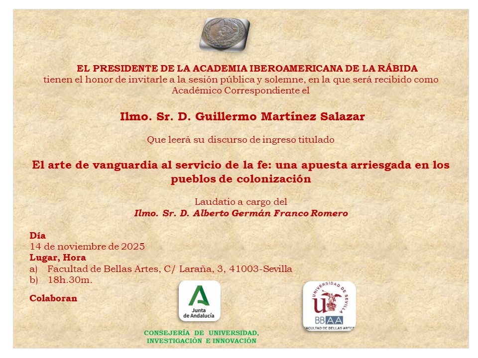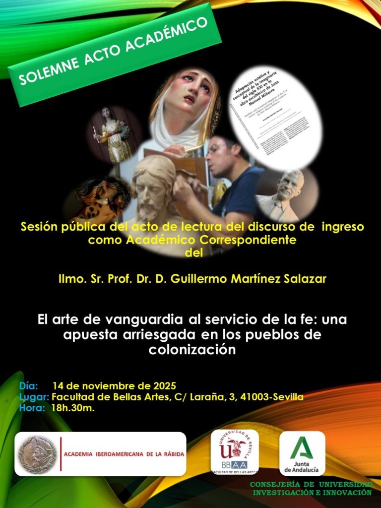 Se celebrará sesión pública del acto solemne de la lectura del discurso de ingreso como Académico Correspondiente del Ilmo. Sr. Prof. Dr. D. Guillermo Martínez Salazar, que leerá su discurso de ingreso titulado: El arte de vanguardia al servicio de la fe: una apuesta arriesgada en los pueblos de colonización, el próximo día 14 de noviembre de 2025 a las 18h.30m . en la Facultad de Bellas Artes, C/ Laraña, 3, 41003-Sevilla.